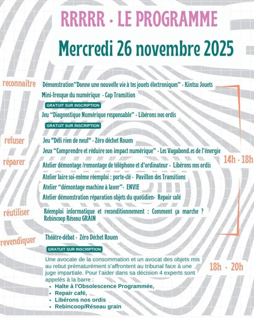 Le mercredi 26 novembre, de 14h à 20h, Zéro Déchet Rouen, en partenariat avec le Pavillon des transitions et une dizaine d’associations locales, a imaginé une journée « RRRRR » pour refuser, réduire, réparer, réutiliser ces équipements et revendiquer de bonnes pratiques !