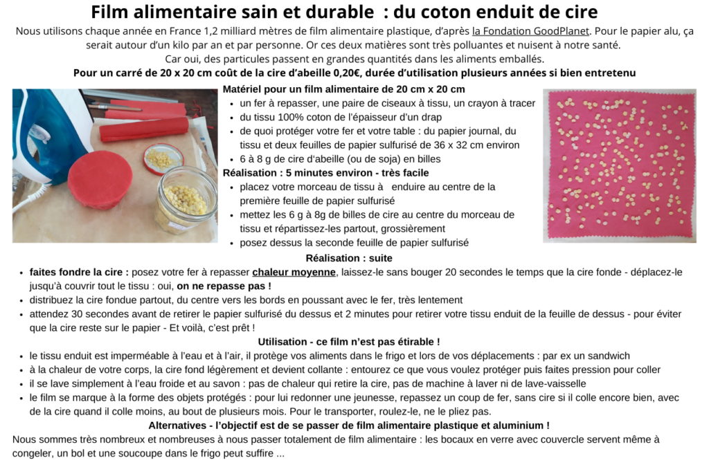 Le film plastique alimentaire et le papier alu sont à usage unique et posent des problèmes pour notre santé et l’environnement en migrant dans les aliments. Fabriquons simplement nos films alimentaires lavables et sains!